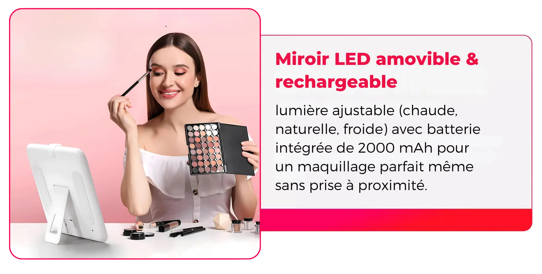 Oui ! Le miroir LED offre 3 modes d’éclairage (chaud, naturel, froid) et vous pouvez régler l’intensité pour un maquillage précis dans n’importe quelle condition de lumière.